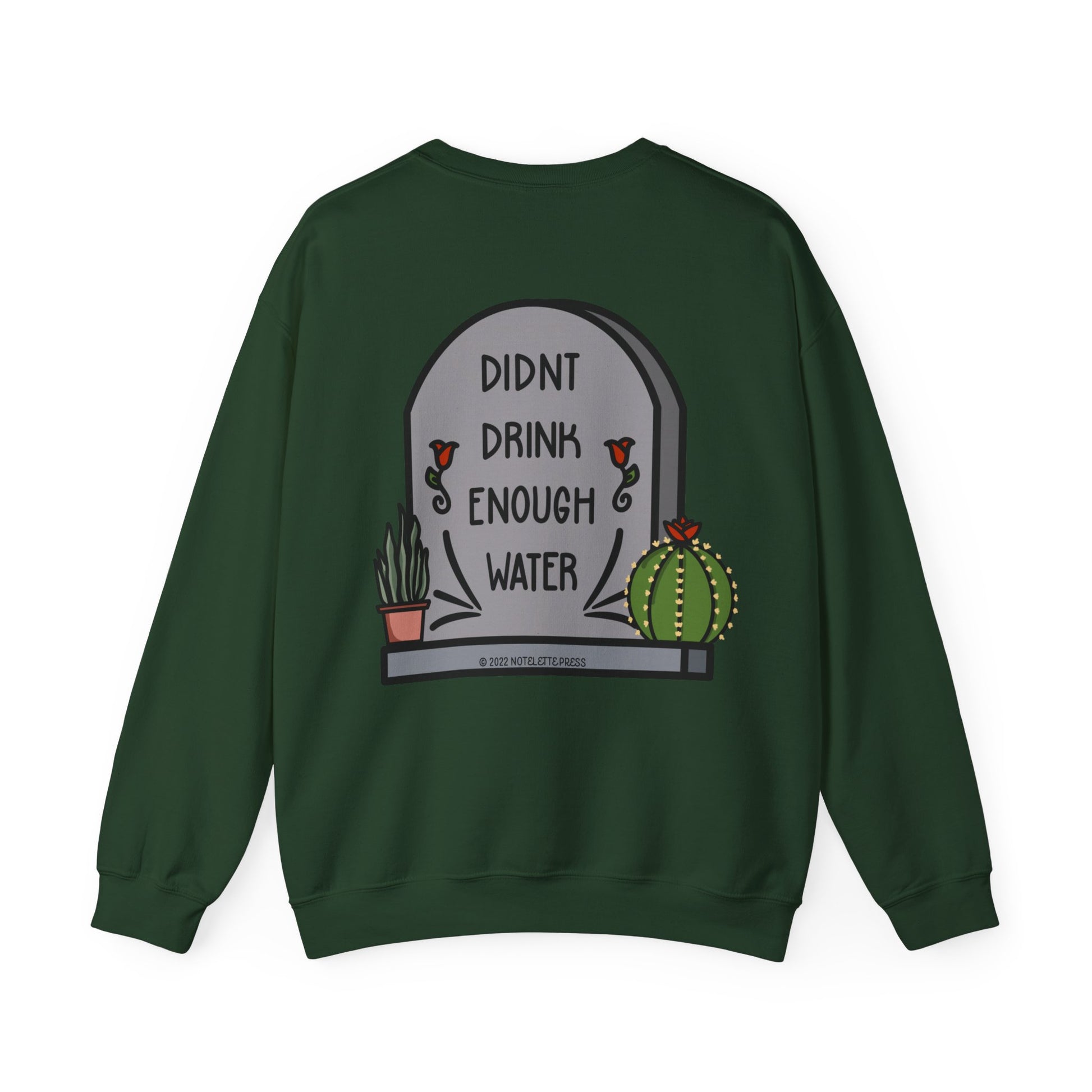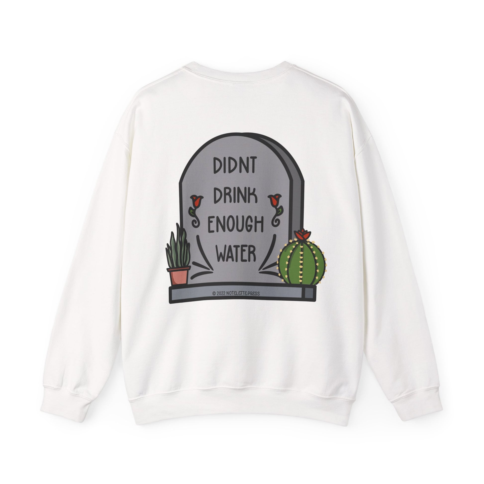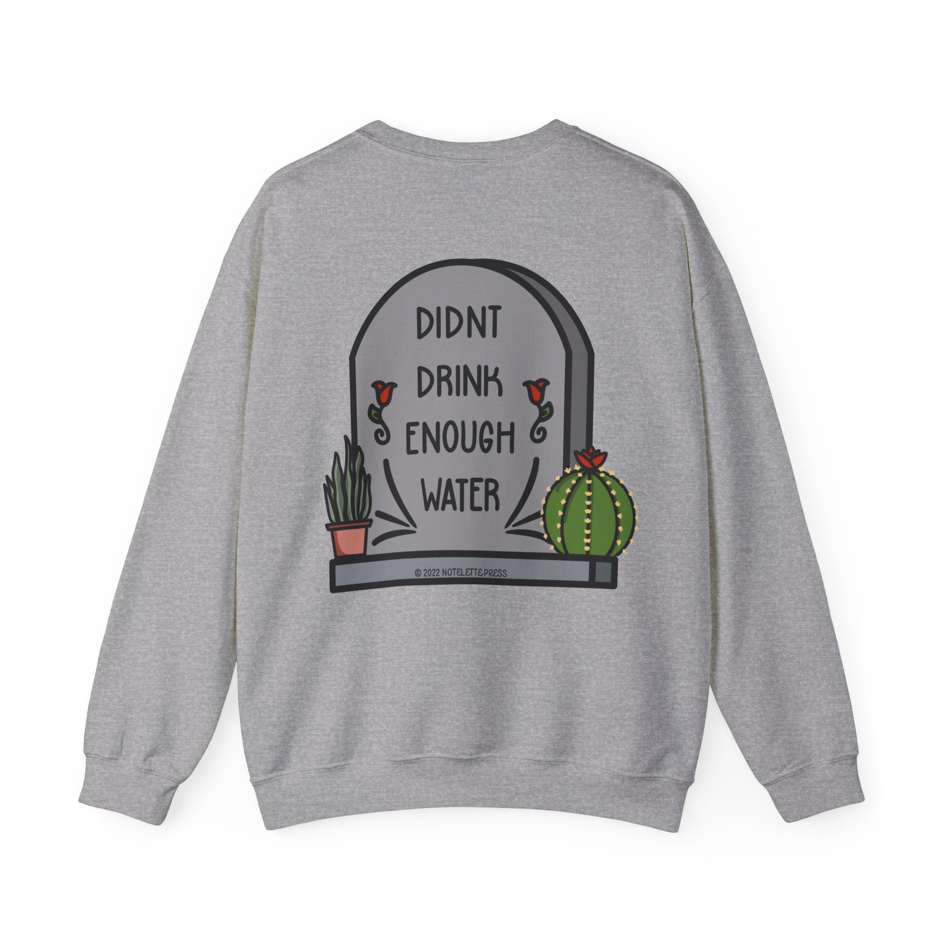 This crewneck sweater is your new cuddle buddy for those days when hydration wasn’t top of your to-do list. Soft, warm, and just the right amount of oversized, it features the cheeky “Didn’t Drink Enough Water” tombstone design wrapped in cute succulents, because self-love includes forgiving your forgetfulness. Made with durable stitching and a comfy ribbed collar, this sweater keeps you cozy while serving serious style and humor. Perfect for lounging, errands, or showing off your witty side wherever you go.